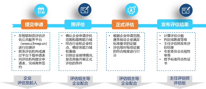 评估流程整体分为四个阶段:提交评估申请、预评估、正式评估、发布评估结果